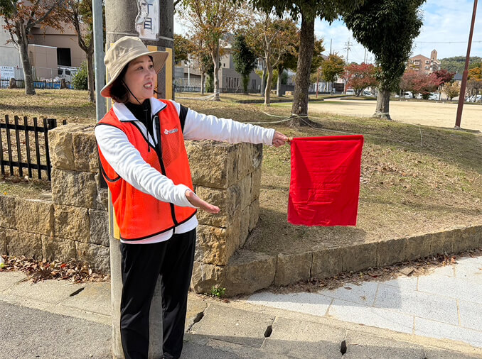 「道標(どうひょう)」という道しるべが地図をあまり見なくても歩けるように掲示してあります。車道の横断時や迷いやすい箇所にはスタッフが立ち、参加者を案内しています。