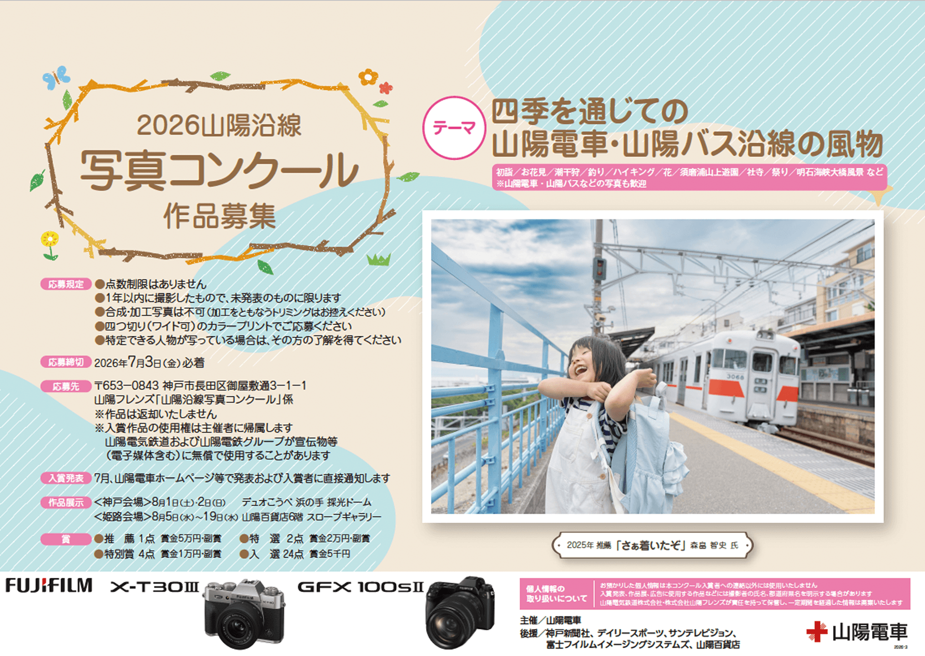 ・応募作品は合成・加工不可・未発表で1年以内に撮影した写真に限ります ・入賞作品の使用権は主催者に帰属し、山陽電車および山陽電鉄グループが宣伝物等(電子媒体含む)に無償で使用する場合があります |